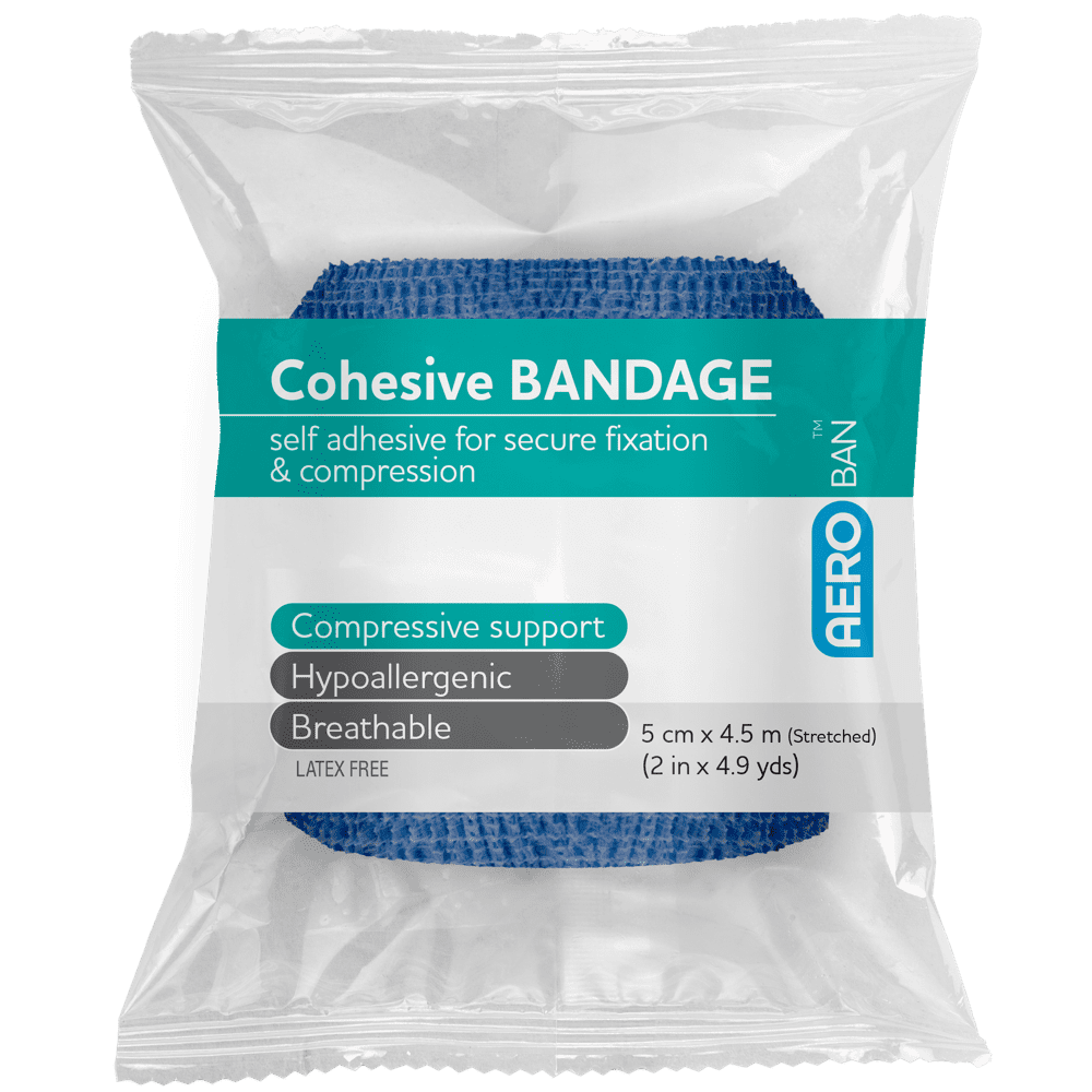 AeroBan Cohesive Bandage Blue is designed to provide comfortable, dependable support without sticking to skin, hair, or clothing. The cohesive material clings to itself, creating a secure wrap that stays in place once applied while remaining easy to remove. This makes it an excellent choice for securing dressings, supporting joints and soft‑tissue injuries, or providing light compression in everyday first aid situations.