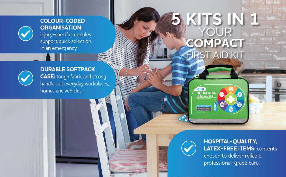 Ideal for small workplaces, households, vehicles and recreational activities, AeroKit Mini Modulator offers the reassurance of fast access first aid in a compact, easy-to-carry format. Its thoughtful organisation, quality components and clear visual design make it suitable for both confident first aiders and people with minimal training.