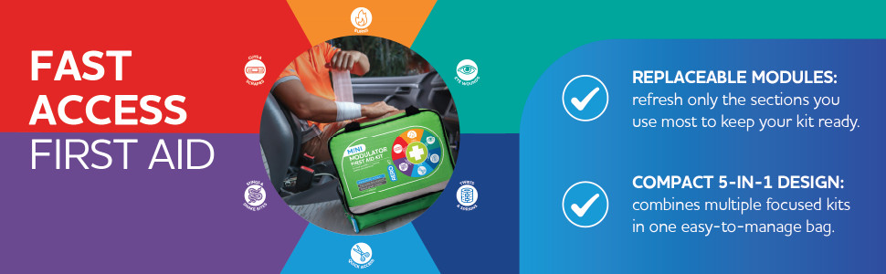Supplied as a single compact kit, this option combines five colour-coded injury modules in one soft case, providing organised coverage for common incidents in workplaces, homes, vehicles and outdoor settings.