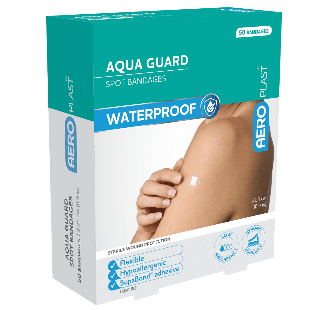 This option supplies AEROPLAST AquaGuard spot dressings in a box of 50 circular bandages, each with a diameter of 2.25 cm. The compact pack size suits home, workplace, and travel kits where a ready supply of waterproof, transparent spot dressings is needed for small cuts, grazes, and puncture sites without taking up excessive storage space.