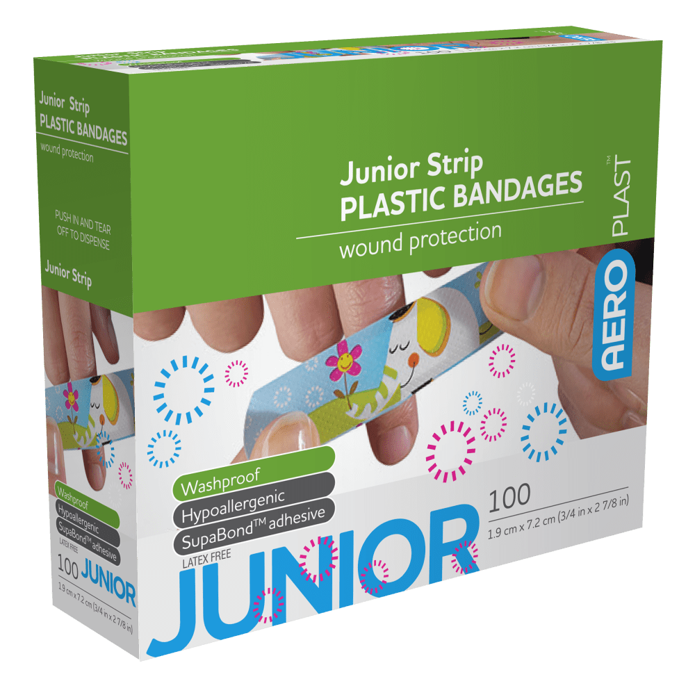 The Junior Design 7.2 x 1.9cm option combines the core AeroPlast Plastic construction with a child-friendly plaster size suited to small fingers and hands. It offers strong, hypoallergenic adhesion, a soft SupaSorb wound pad, and a conforming, washproof backing to provide comfortable protection for minor wounds on younger users.