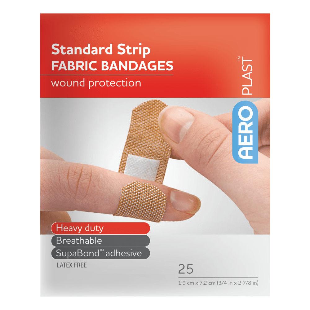 AEROPLAST Premium Fabric adhesive bandages provide durable, long-wearing protection for minor cuts, grazes and abrasions in workplaces, education, hospitality and home first aid. A premium-weight woven backing conforms to fingers, knuckles and joints while allowing airflow to the skin for comfort. SupaBond extra‑strong adhesive delivers high holding power that resists edge lift during frequent hand use and movement. The adhesive system is latex‑free and hypo‑allergenic for broad skin compatibility, supporting users with sensitive skin.