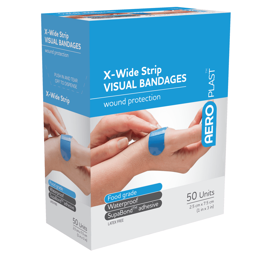 AEROPLAST Premium Visual is a blue, visually detectable adhesive bandage range engineered for food preparation, catering, and processing environments where fast identification matters. The vibrant blue backing contrasts clearly with food and stainless-steel surfaces to support routine hygiene checks. Each dressing is latex‑free and hypo‑allergenic to suit diverse teams and sensitive skin while maintaining dependable performance throughout demanding shifts. Sterile, single‑use, individually wrapped dressings protect product integrity until application.