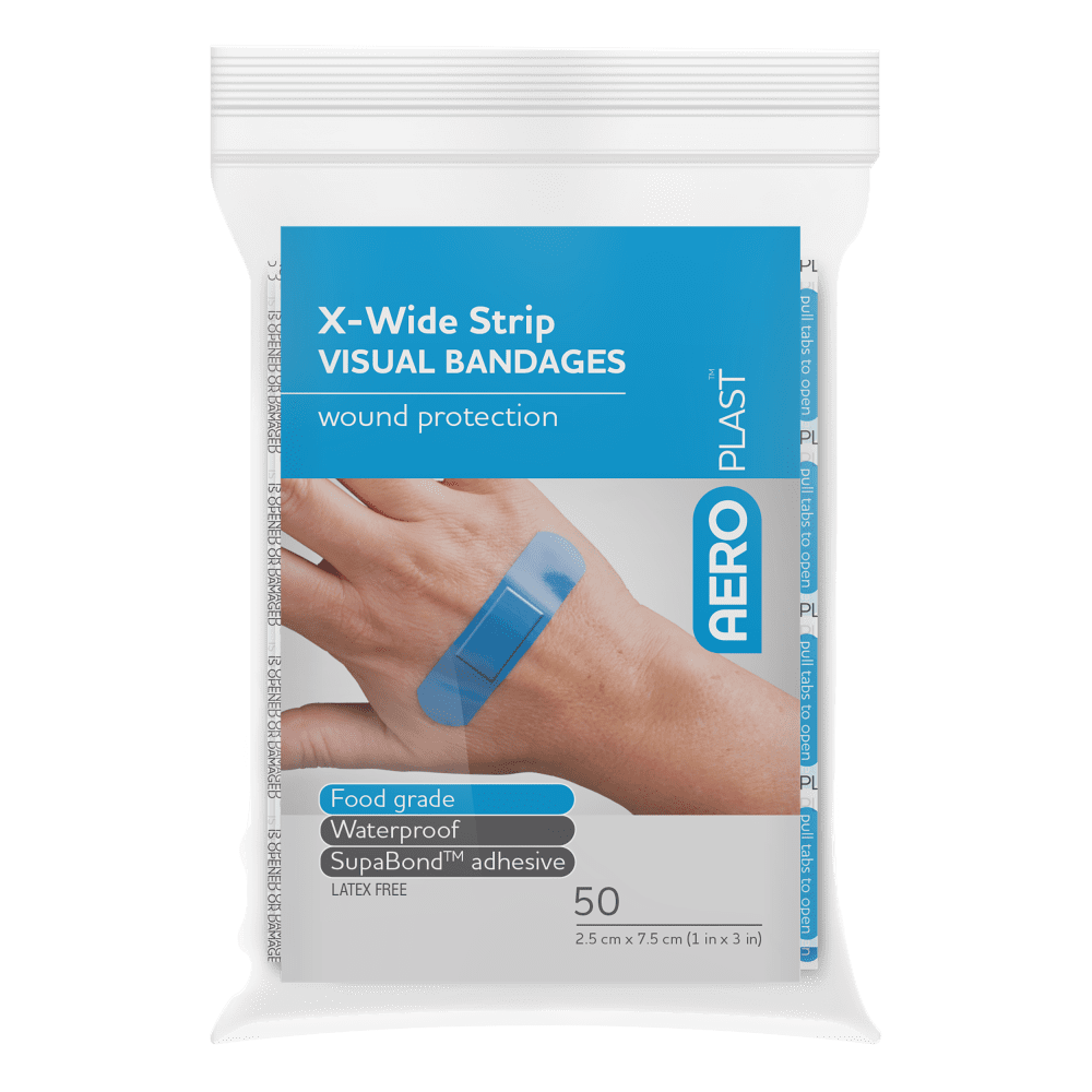 AEROPLAST Premium Visual is a blue, visually detectable adhesive bandage range engineered for food preparation, catering, and processing environments where fast identification matters. The vibrant blue backing contrasts clearly with food and stainless-steel surfaces to support routine hygiene checks. Each dressing is latex‑free and hypo‑allergenic to suit diverse teams and sensitive skin while maintaining dependable performance throughout demanding shifts. Sterile, single‑use, individually wrapped dressings protect product integrity until application.