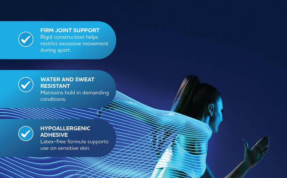 The tape features competition-level rigidity that limits excessive joint movement while still allowing functional motion. This makes it well suited to preventative taping before activity as well as supportive taping after minor sprains and strains. The hypoallergenic, latex-free adhesive is formulated to provide a secure hold while being mindful of skin sensitivity, supporting comfort even during extended wear. A heat-responsive bond helps the tape stay in place when the body warms up through exertion.