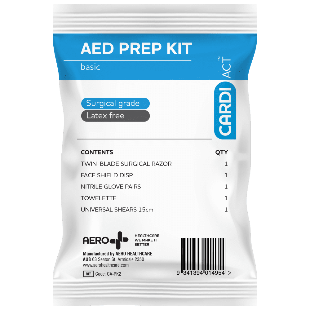 Basic AED preparation kit, comprising a proper surgical razor designed to cope with tough hair, trauma shears for cutting clothing, a drying towel, 1 pair of nitrile gloves, and a CPR face shield of premium quality. The kit is packed in a clear case to allow rescuers to identify contents easily and quickly.