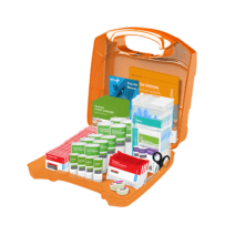 BS 8599-1:2019 provides advice on the amount and size of the first aid kits required for different working environments; based on the number of employees and risk category