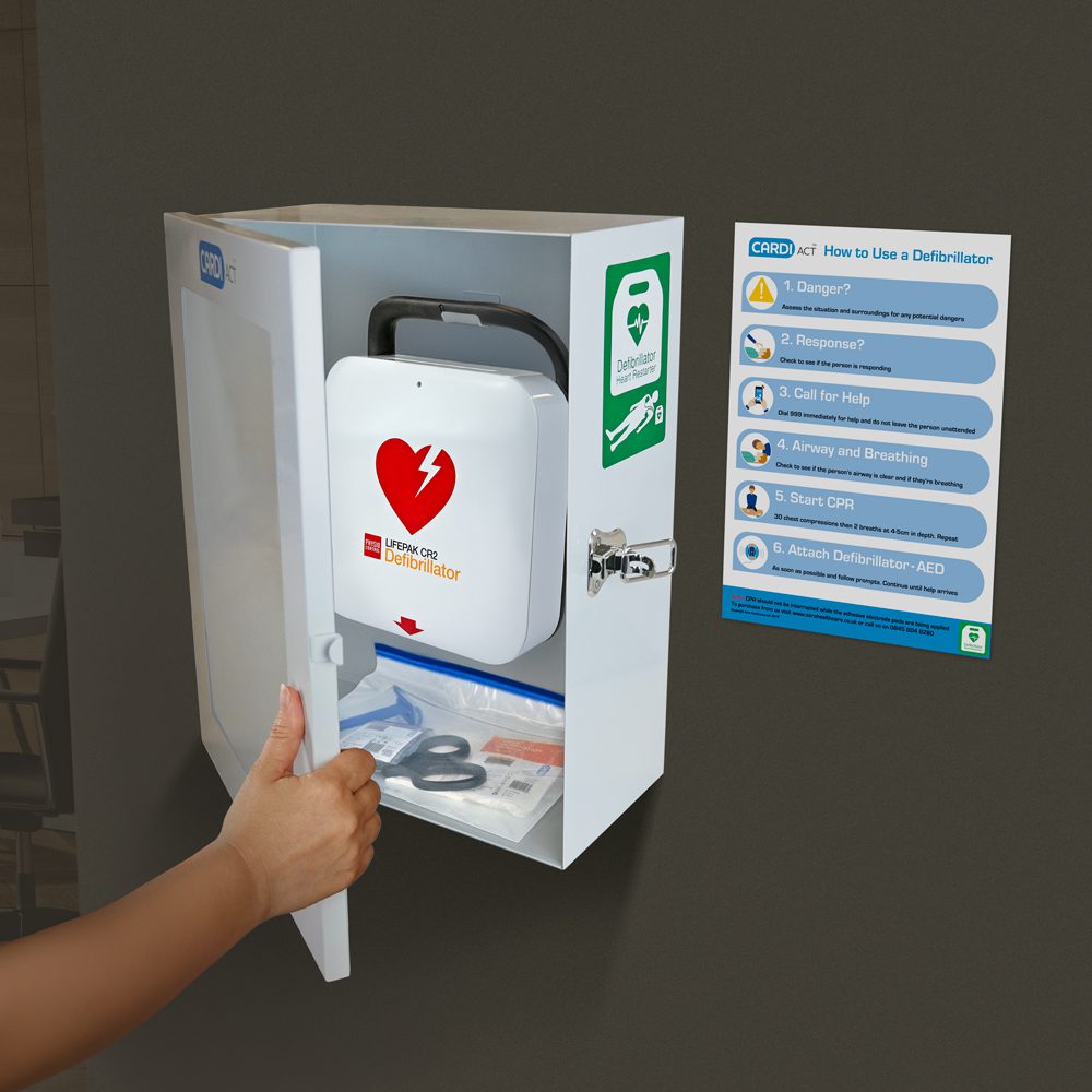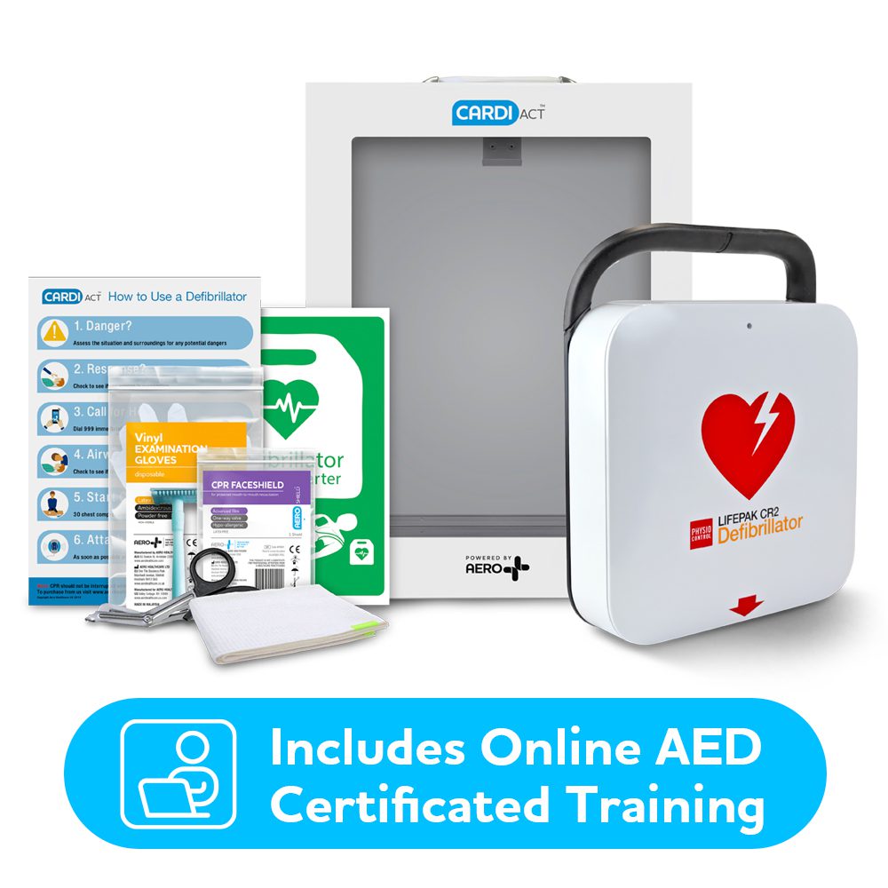 This comprehensive defibrillator bundle provides everything needed to install, prepare, and confidently use an Automated External Defibrillator (AED) from day one. Designed for workplaces, community buildings, and public spaces, it combines a reliable and extremely user-friendly Lifepak CR2 AED with essential supporting equipment, clear guidance materials, and certified online training.