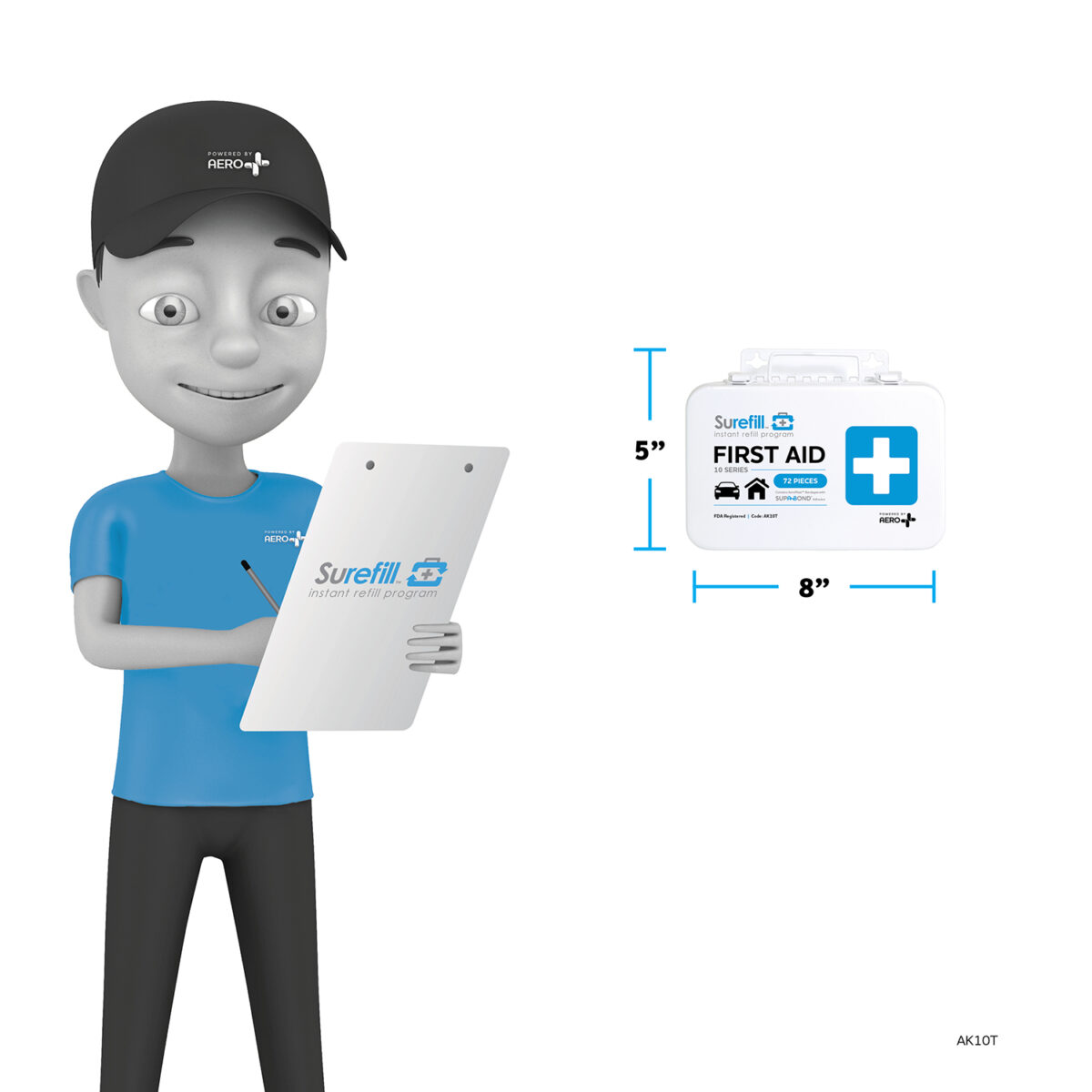 Surefill™ All Purpose 10 Series Metal First Aid Kit contains 72 essential first aid supplies for treating minor woundsand injuries. Ideal for home, travel and on the go use. These metal cases ensure contents are protected from the day to day exposure to dust and damage.