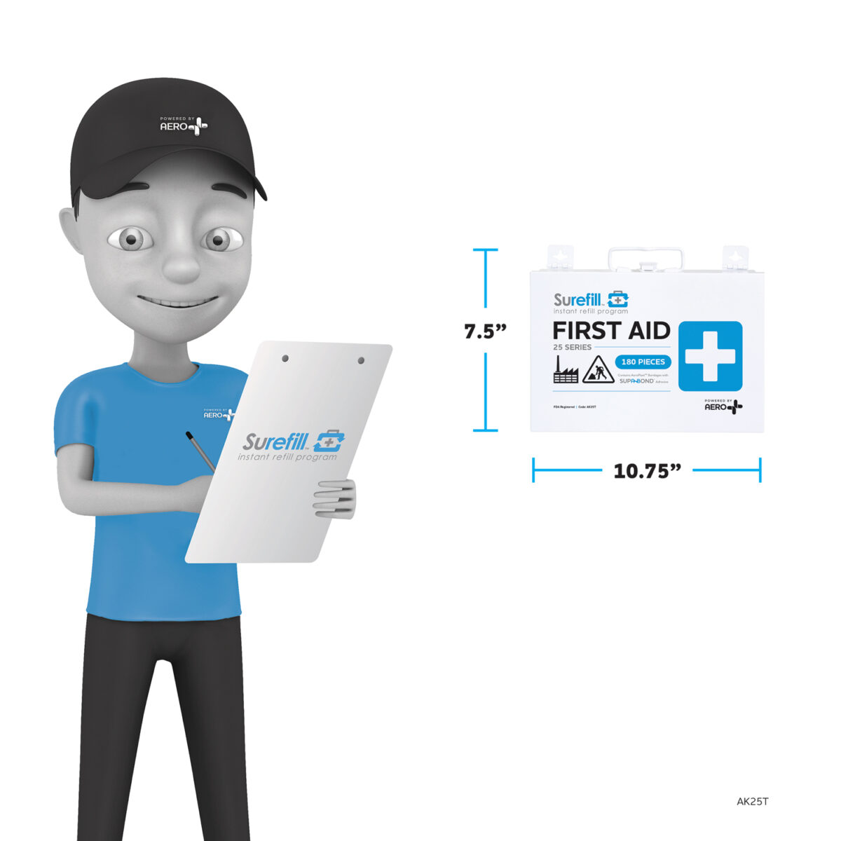 Surefill™ ALL PURPOSE 25 Series Metal First Aid Kit contains 180 essential first aid supplies for treating minor wounds and injuries. Ideal for home, travel and on the go use. These metal cases ensure contents are protected from the day to day exposure to dust and damage.